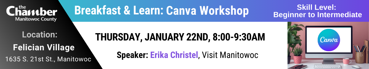 Please submit your specific questions about Canva when you register in the comment boxes provided. Otherwise, you can email your questions for the speaker to: shannon@chambermanitowoccounty.org.